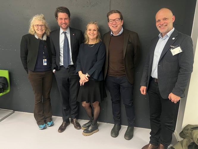 Bilde: Mari Trommald (KS/HO21), Vegard Grøslie Wennesland (statssekretær NFD), Ellen Rønning-ARnesen (statssekretær HOD), Tarje Bjørgum (Abelia/HO21), Per Olav Østbyhaug (St. Olavs hospital/HO21)